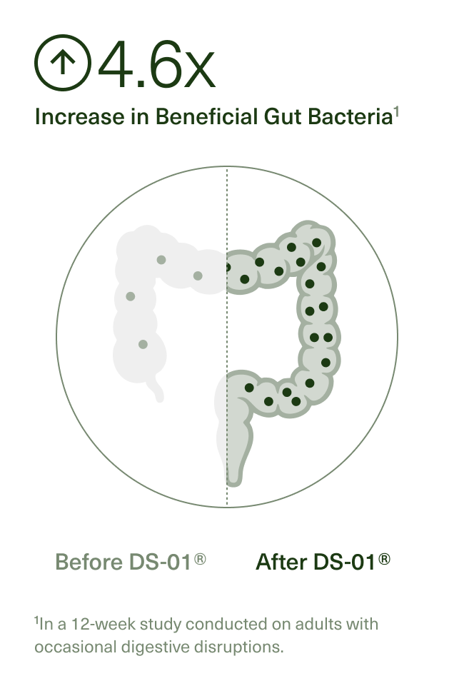 You are home to a community of trillions of microorganisms, including 38,000,000,000,000 bacteria that live in and on you. They perform critical functions like digesting food, managing inflammation, and synthesizing key vitamins, metabolites and neurotransmitters. This is the microbiome. By supplementing your gut microbial makeup, DS-01® provides benefits for both digestive and whole body health.