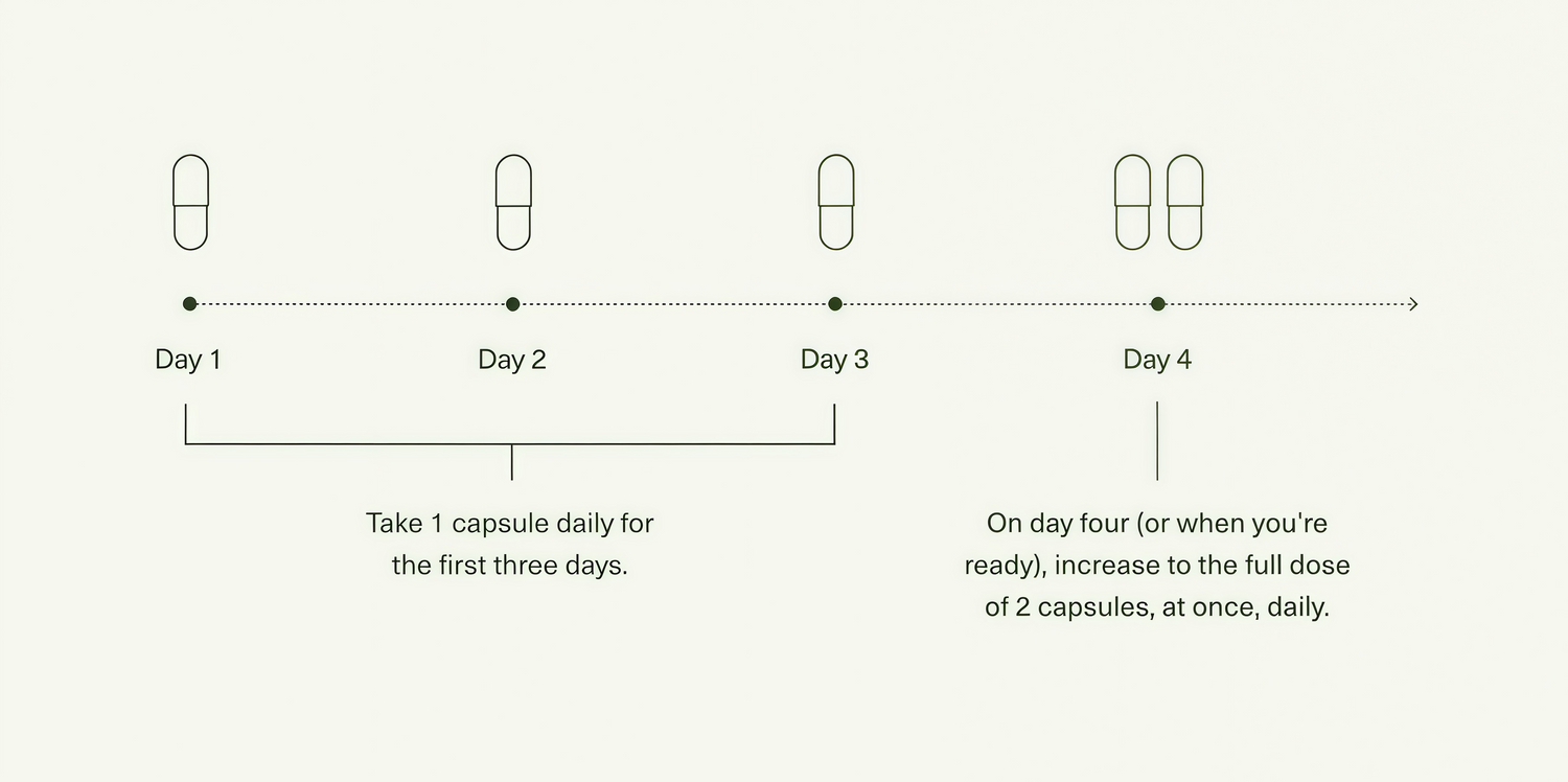 On day four (or when you’re ready), increase to the full dose of 2 capsules at once, daily. Ideally, take both capsules on an empty stomach or at least 10 minutes prior to a meal.