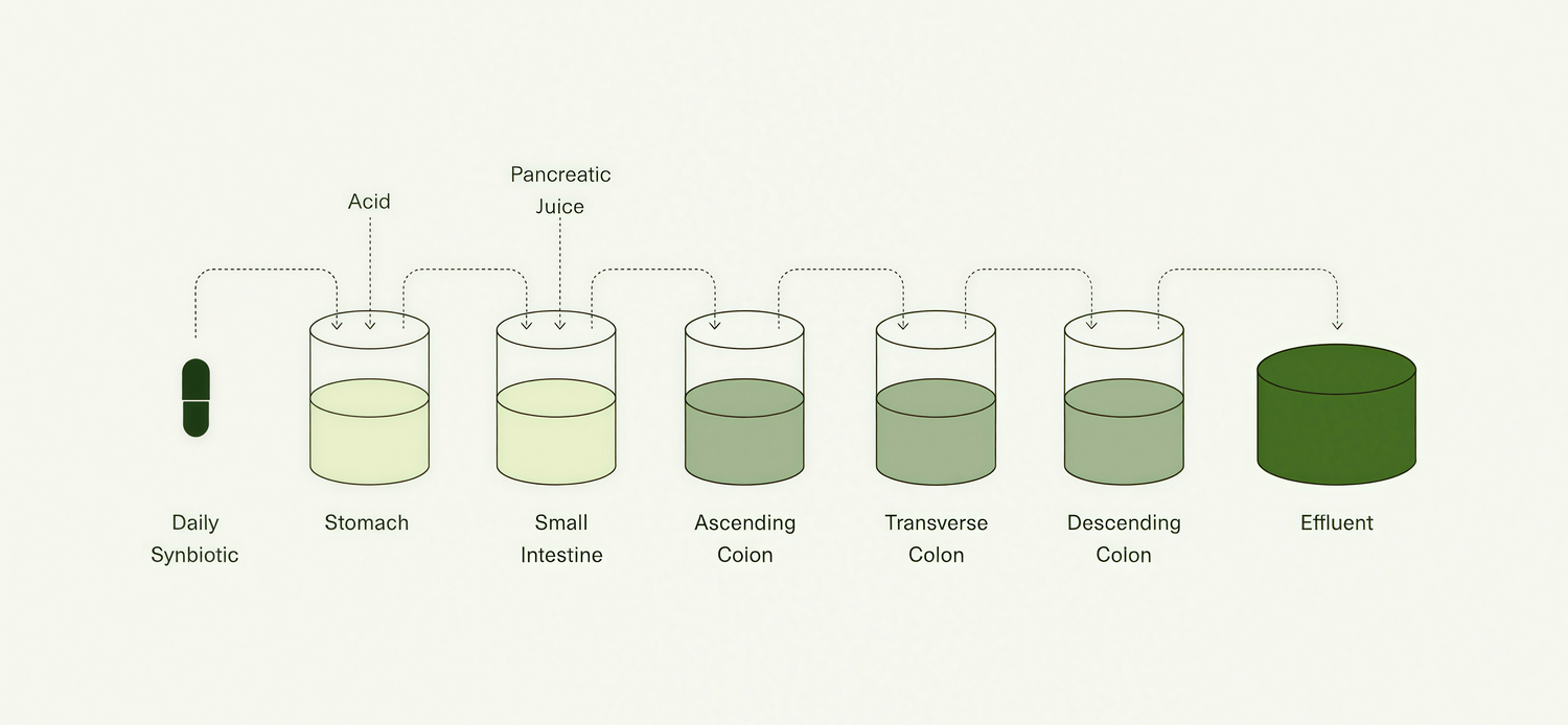 To evaluate the survival of our probiotics, we test with a Simulator of the Human Intestinal Microbial Ecosystem (SHIME®)—the closest system developed to model human digestion and the gut. It recreates the physiological conditions and biological processes (food uptake, peristalsis, digestive enzymes, pancreatic and bile acids, and time spent in each step) representative of the human gastrointestinal tract.